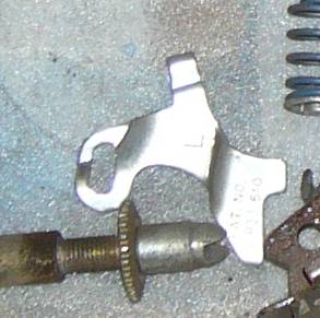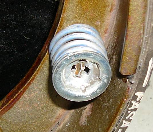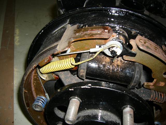 Kun kengät ovat paikallaan, varmista että kenkien välinen vipu (ruuvimeisselin kärjen alla) tulee kuvan mukaisesti paikalleen jousen kera. Vivun päässä oleva ura tulee kengässä olevaan vastaavaan uraan. Kuvasta puuttuu tämä jarrusylinterin päässä oleva männävarsitappi, joka on syytä olla paikallaan. Esimerkin tapauksessa ne laitettiin jälkeenpäin (onnistuu niinkin, on vain vaikeampaa) niiden ollessa sinkkaamolla.