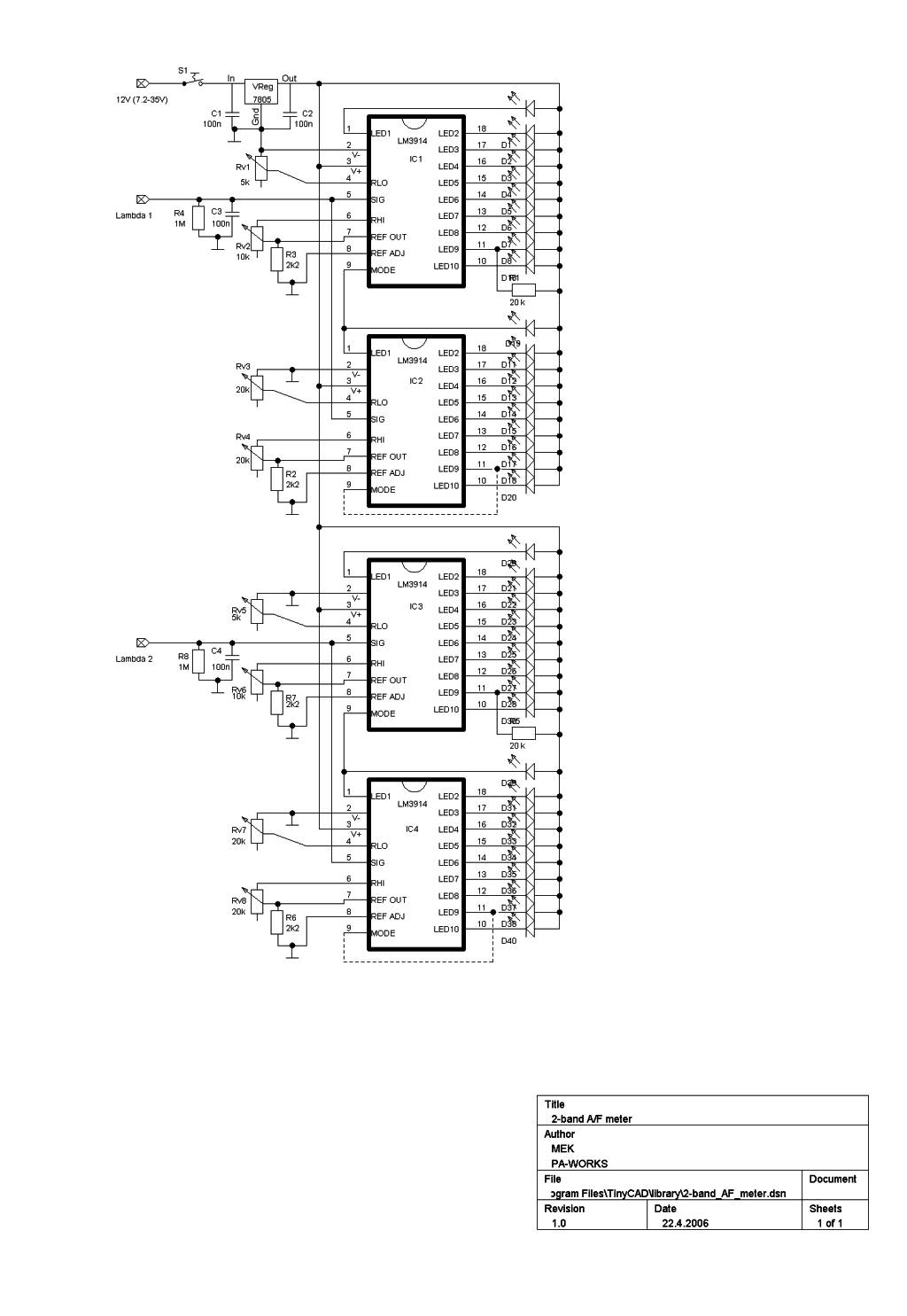 Itse mittarihan on periaatteessa muunnin, jolla tuo lambda-anturin jännitesignaali muunnetaan sopivin portain syttyviksi LED-valoiksi. Tähän tarkoitukseen sopii hyvin Dot/Bar display driver LM3914. Kun halusin 2-kanavaisen ja 20 LEDiä per puoli, tarvitaan niitä 4 kpl + tarvittavat oheiskomponentit. Kuvassa suunnittelemani versio aiheesta. Klikkaamalla suuremmaksi.