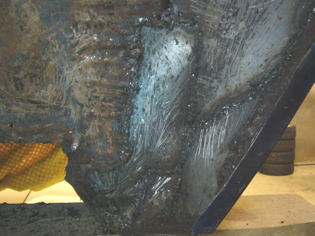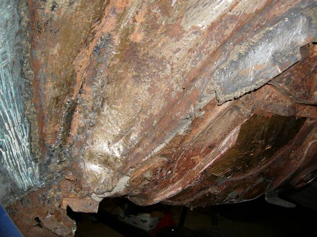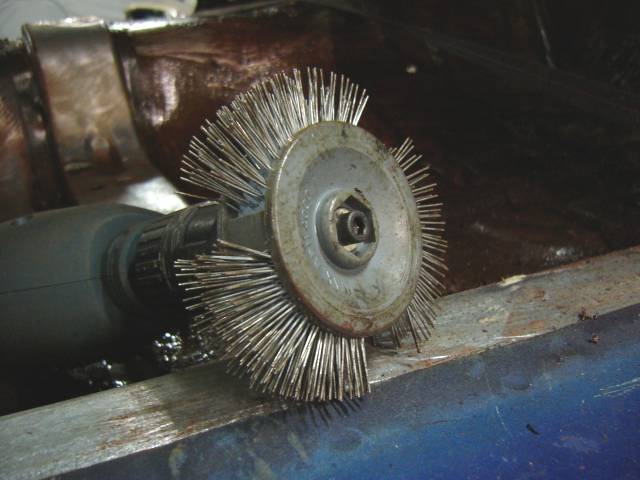 Korin pohja on luonnollisestikin massan, ravan, öljyn ja ties minkä peitossa. Tämä on kaikki puhdistettava pois. Tarkoitukseen erittäin sopiva työkalusetti on halpa puutalttasarja, sekä tasapäinen, että kourumallinen kaareviin muotoihin. Tässä tapauksessa halpa on hyvä; puusepäntöihin tämmöiset Hong Kongin satsit eivät kelvanne, mutta massanraavintaan sen sijaan hyvin. Massan raapimisessa pyritään välttämään tarpeetonta naarmuttamista. Kuten kuvasta näkyy, onneksi suurimmassa osassa pohjaa massan alta tuli vastaan hyvin säilynyt alkuperäismaalin värinen pelti. Kaikissa kohtaa ei näin tosin valitettavasti ollut.