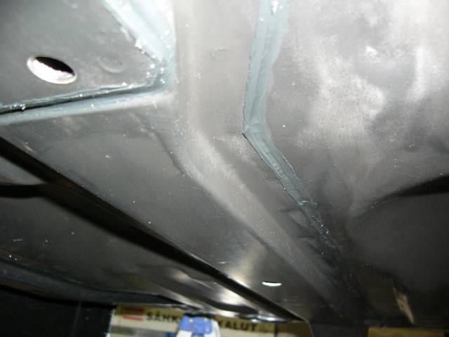 Torinon pohjahan oli siis hiekkapuhallettu, joten kävin vain silmämääräisesti pohjan läpi, putsasin pyörivällä harjalla ruosteen alut pois ja lopuksi rasvanpoistoainekäsittely paikkoihin, joita olin sormeillut, tai edes epäilin jossain välissä sormeilleeni. Lopuksi painilmapuhalluksella irtonainen pöly pois ja ensimmäinen kerros POR-15 RP:tä pensselillä pintaan.