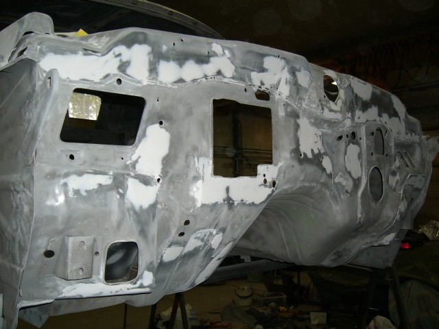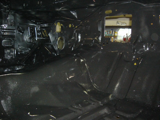 Kabiini oli hiekkapuhallettu siinä missä pohjakin. Sisältä, samoin kuin peräkontistakin, oli maali poistettu neekerintukalla ja sen päälle puhallus oli aika pinnallinen, joten kiiltäviä kohtia oli joitakin ja työskentely lattian päällä oli kiillottanut ja sotkenut pohjaa lisää. Joten siis rasvanpoistoainella liat pois ja Metal Ready päälle. POR-15 RP:hän vaatii karkean tai primeroidun tartuntapinnan.