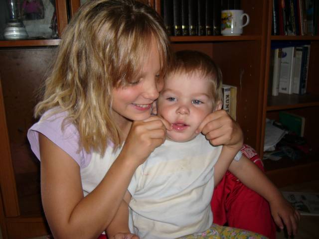 My youngest son Niko sitting on my daughter Roosa-Mari's lap: "Look, daddy is home and not in the garage as usual !"