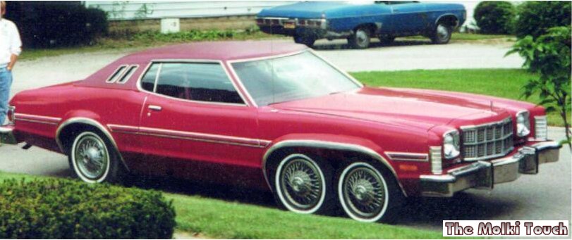 I came across this rarity when surfing in the net: Somewhere in France there is some party called Molki, which has attracted attention with it's 6 -wheel conversion ideas. In this case 6 -wheeler is made on the basis of -75 Gran Torino Elite. Colour also matches nicely for Dember's Picture Of The Month !