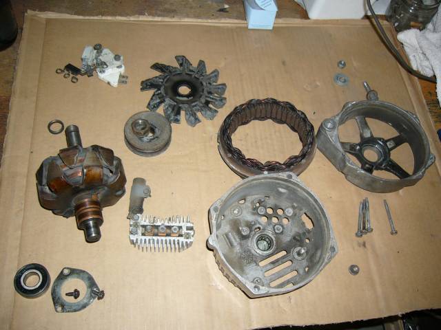 Etulaakerin voit testata pyörittämällä roottoria mahdollisimman lujaa, jolloin viallinen laakeri yleensä ääntä ja/tai tärisee. Joka tapauksessa, osat irroitetaan toisistaan. Kuvassa vasemmalla ylhäällä lataussäädin hiilipitimineen, alhaalla vasemmalla etulaakeri pidikkeineen. Sen yläpuolella roottorin vieressä tasasuuntausdiodisilta. Takalaakeri on tässä vaiheessa vielä kuoressaan kiinni. Kaikki edellämainitut sisältyvät korjaussarjaan.