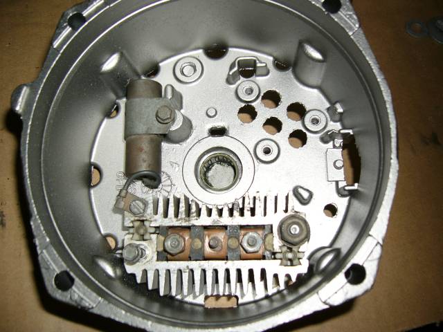 ...seuraavaksi diodisilta ja kondensaattori paikalleen... Diodisilta kannattaa mitata ennen asennusta. Miinus-diodit mitataan laittamalla musta johto runkoon ja mitataan vastusmittauksella vuorotellen kustakin navasta. Ei saisi näyttää mitään. Seuraavaksi johdot toisin päin, mittaus taas kaikista kolmesta ja virran tulee kulkea. Plus-suunta mitataan samoin, vain toinen mittajohto kyketään BATT -napaan eikä runkoon.