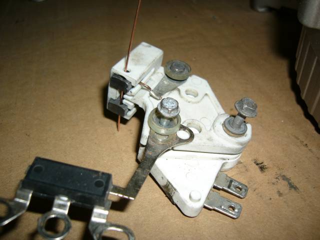 Sen jälkeen onkin vuorossa hiilisilta/lataussäädin -yhdistelmä. Muoviosat koostuvat kahdesta osasta, joita pultit pitävät paikallaan. Huomaa, että pulttien alla on eristerenkaita tietyissä paikoissa, joten ennen osien irroittamista kirjaa tarkkaan ylös, mikä kuuluu minnekin. Huomaa kuvasta myös langanpätkä, jolla hiilet on lukittu pesäänsä. Jos hiilet ovat irrallaan alle 10 milliset, uusi ne. Kuvassa näkyvä musta kolmoisdiodi kannattaa myös mitata. Mittarin musta johto vastusmittausasennossa säätimen puoleiseen liittimeen ja mitataan vuorotellen kustakin kolmesta navasta. Sen jälkeen käännetään mittarin johdot. Virta saa kulkea vain toiseen suuntaan.