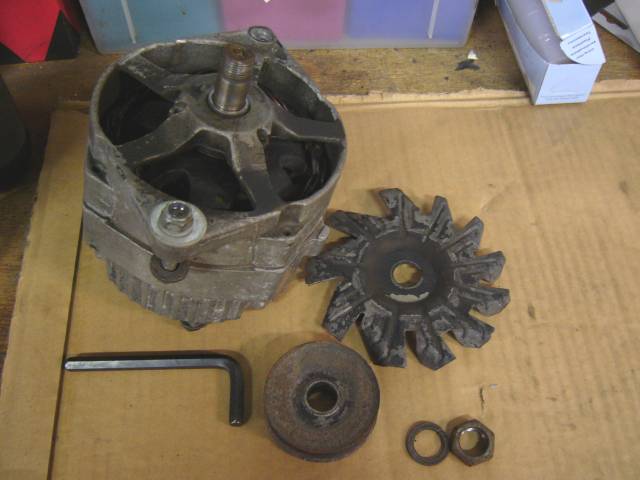 Ensimmäisenä laturi kannattaa kiinnittää tukevasti penkkiin siivapyörän ja tuuletinrattaan irrottamiseksi. Akselin päähän tarjotaan sopivaa kuusikulma-avainta ja siitä vastaan pitäen avataan akselila oleva mutteri, jolloin siivapyörä ja tuuletinratas lähtevätkin irti. Ei tosin välttämättä helposti...