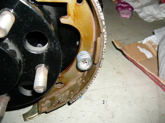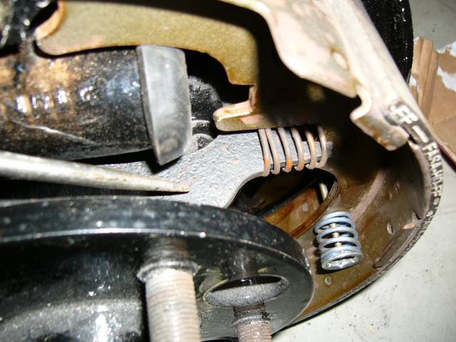 Kun kengät ovat paikallaan, varmista että kenkien välinen vipu (ruuvimeisselin kärjen alla) tulee kuvan mukaisesti paikalleen jousen kera. Vivun päässä oleva ura tulee kengässä olevaan vastaavaan uraan. Kuvasta puuttuu tämä jarrusylinterin päässä oleva männävarsitappi, joka on syytä olla paikallaan. Esimerkin tapauksessa ne laitettiin jälkeenpäin (onnistuu niinkin, on vain vaikeampaa) niiden ollessa sinkkaamolla.